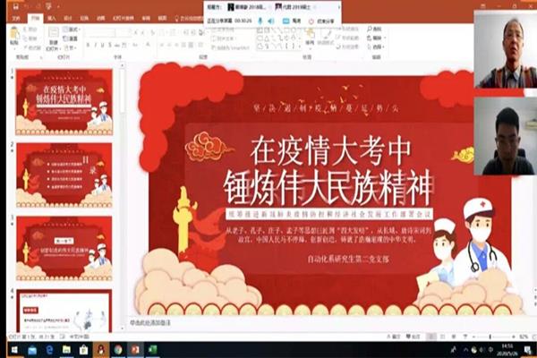 专业教师车海军、沈虹为代表的党支部书记以《在疫情大考中锤炼伟大民族精神》、《从疫情防控中感悟中国特色社会主义制度优势》为主题进行了云党课授课。两位老师结合自己的所见、所闻、所感生动讲述“抗击疫情”先进典型事迹,用一个个感人事迹、鲜活事例、生动实践向青年员工讲清楚中国共产党为什么能、马克思主义为什么行、中国特色社会主义为什么好,坚定同学们“四个自信”,激励同学们把个人理想追求融入党和国家事业之中、砥砺青春意志。