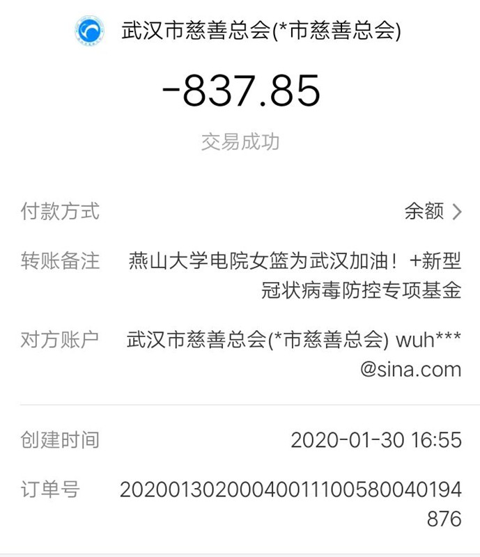 在积极做志愿服务的同时,她看到全国的爱心人士为武汉、为湖北捐款捐物。去年洋佳在校期间利用课余时间做兼职,自己有一些积蓄,她想拿这笔钱支援武汉,向武汉献出自己的一点点爱心。正愁没有渠道,PA视讯集团官网女篮队发出向武汉捐款倡议,作为女篮中的一员,她立即将自己全部的积蓄捐出,电院女篮向武汉市慈善总会捐款共837.85元。