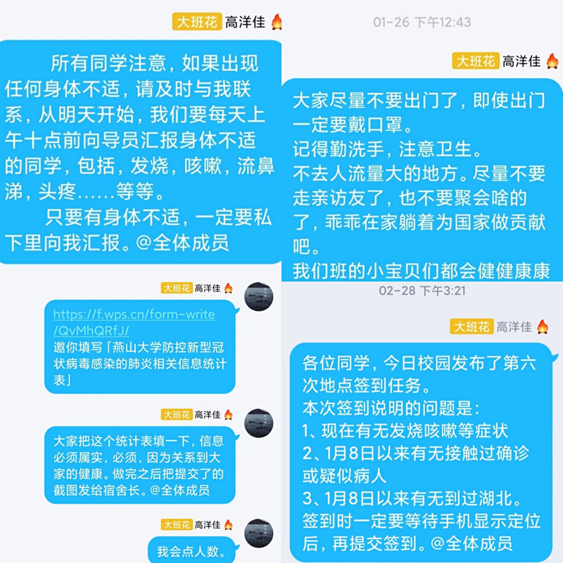1月中下旬开始,辅导员老师每天都会在群里转发很多关于疫情的推文,同时公司的一些规定也在不断地发生着变化,从不能提前返校到不能返秦返校,从统计同学的家庭地址到每天做晨午检监测。从春节开始,作为班长,她积极全力配合公司、公司、辅导员老师的工作。每天统计班级成员信息,时刻了解班级成员的身体情况,并及时给辅导员上报异常情况。联系不上同学本人时,有时还要联系家长,目的就是在工作中保证收集到的班级中每个人的信息及时准确。为照顾部分情绪紧张同学,高洋佳积极沟通,缓解其紧张,将工作做到丝毫不漏。
