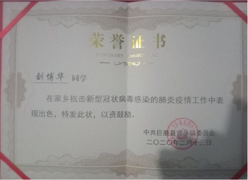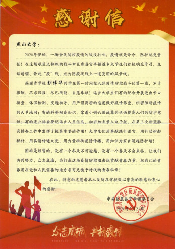 面对疫情严峻形势,刘博华同学没有选择退缩,而是在最危险的时候,主动请战当好防疫“宣传员”,义务值守争当“守门员”,协助村委会疫情防控工作扎实推进。“同志您好,出门请戴好口罩,配合测量体温。”每天,巨鹿县官亭镇董家庄村防控卡口都能听到刘博华熟悉的声音。他说:“生于这个时代,我们每个人都应扛起责任,这是我们年轻人的使命与担当。来者不拒,勇者无敌,我坚信这场战役,我们一定能取得胜利。”正如感谢信中所写:刘博华用奉献践行诺言、用行动竖起标杆,用青春传递大爱,用知识为家乡筑起防护墙!