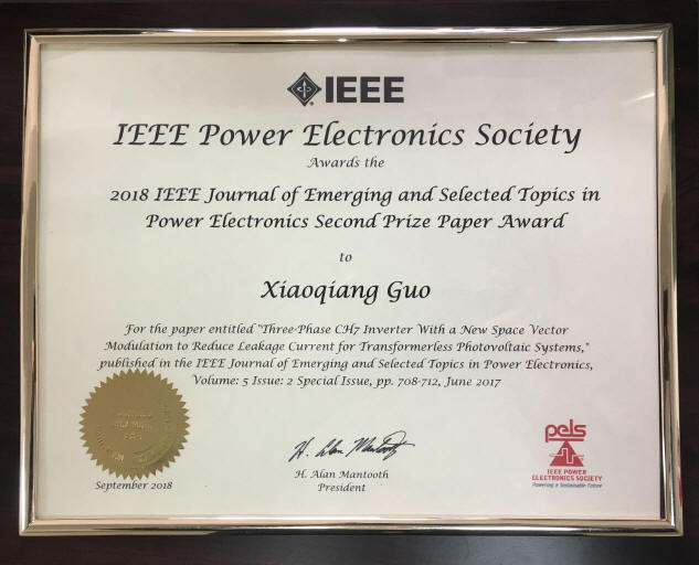 公司PA视讯集团官网郭小强博士获国际期刊IEEE JESTPE 最佳论文奖(Prize Paper Award),郭小强博士应邀出席了在美国召开的IEEE期刊最佳论文奖的颁奖典礼,主席Alan Mantooth博士颁发了最佳论文奖章和500美元奖金,该奖是国际IEEE电力电子学会历史上首位国内独立作者获奖,极大地提高了公司电力电子学科在国际上的影响力和知名度。