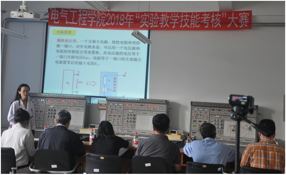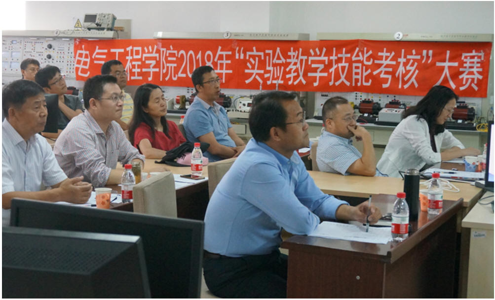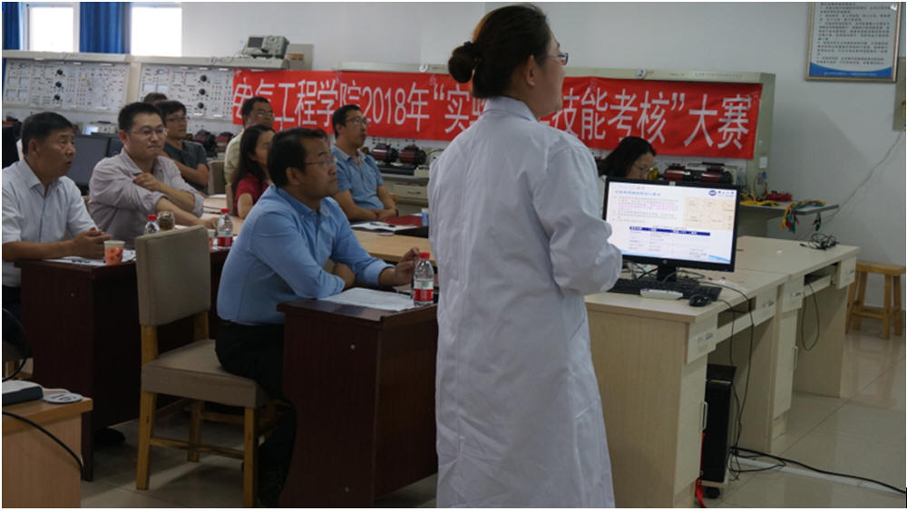 本次考核分为基础组和专业组两个组别,于9月21日全天同时进行,共有35名实验教师参加考核。基础组规定考核范围为电路原理和模拟电路两门课程课内实验,专业组按照学科考核电气控制与PLC、传感器原理、电力电子技术三门课程课内实验,教师需在规定时间内完成实验讲解及操作。