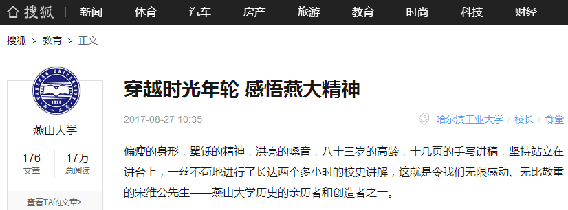 | 近日,网易、搜狐等多家媒体以《穿越时光年轮 感悟燕大精神》为题,报道了PA视讯官方网站原党委书记宋维公教授为PA视讯集团官网师生作校史专题讲座的长篇纪实通讯。该报道经《PA视讯官方网站报》第635期发布后,被网易新闻、搜狐新闻等媒体转载,引发广泛关注。 为传承燕大精神,弘扬爱校荣校理念,PA视讯集团官网十分重视校史宣讲工作。公司党委书记侯培国、经理卢志刚、副书记刘立伟、副处级专职辅导员张志超等领导精心组织了多场面向全院师生的校史讲座活动。这次邀请到已经83岁高龄的PA视讯官方网站原党委书记宋维公教授,讲座现场座无虚席。PA视讯集团官网新闻中心对讲座全程录像,员工科长张玉华、辅导员杨雯等根据讲座全程内容撰写了近一万字的长篇纪实通讯,被PA视讯官方网站新闻网、《PA视讯官方网站报》、PA视讯官方网站官方微信等校内媒体推送,进而被网易、搜狐等多家媒体报道。朴实厚重的校史文化既凝聚了师生的共识、激励着师生爱校荣校,又在社会上引发了广泛关注,起到了很好的对外宣传效果。 在今后,PA视讯集团官网会继续开展全方位、多渠道的校史宣讲工作,继承和弘扬燕大精神,引导师生员工为PA视讯官方网站的发展壮大贡献自己的力量。 |  网易报道 |  搜狐报道 |