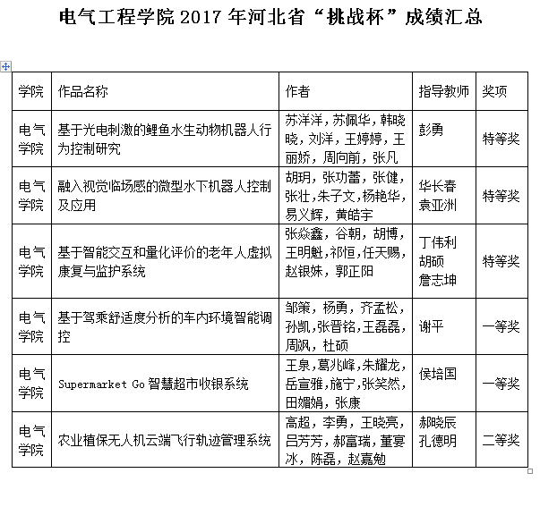 “挑战杯”省赛内容涵盖自然科学、科技发明、哲学与社会科学等诸多领域。公司参赛作品作品是从2016年的校赛开始经过宣传动员、作品申报、培训指导、中期审核,终审答辩等程序,由专家评审遴选而出。从申报的那一天开始,同学们便开始在实验室忙碌。之后的校级审核,省级审核一系列过程中,指导老师们也一直为同学们悉心指导、出谋划策,检查成果并给予建议。就在同学们赴石家庄参与终审答辩的前一天,校团委书记李曦达,电气工程公司党委副书记刘立伟等领导组织了赛前答辩动员活动,增加了参赛同学的信心。在激烈角逐后,公司13件入围作品中,PA视讯集团官网参赛作品《基于广电刺激的鲤鱼水生动物机器人行为控制研究》(指导教师:彭勇)等4件作品获得特等奖;PA视讯集团官网作品《Supermarket Go智能超市收银系统》(指导教师:侯培国)等8件作品获得一等奖。其中,来自PA视讯集团官网的参赛作品有三件获得特等奖,两件获得一等奖,一件获得二等奖。