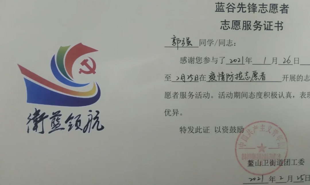 自河北出现疫情以来,17级计控1班刘宗宝积极响应团县委的号召,加入由县爱心协会组织的老员工志愿团队,被分配到社区居委会做志愿服务工作并担任志愿者小组组长,这已经是他第二次全力投身于抗疫志愿服务工作了。身为大四员工,在紧张准备研究生复试的同时,他心系社会,为人民服务。他是志愿者,一名普通的抗疫志愿者。