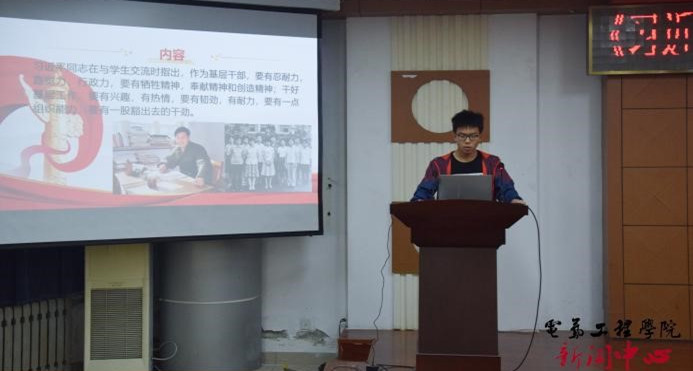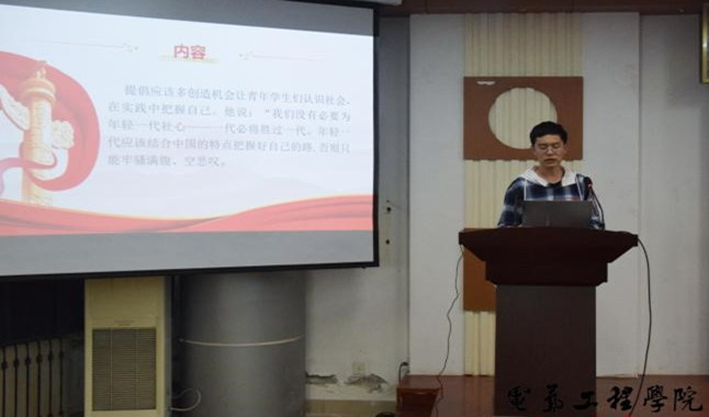 2019级自动化专业3班胡海洋同学与大家分享了“习近平同志提倡年轻人要‘自找苦吃’”部分的主要内容,并发表感想,认为“自找苦吃”就是一种对人生、对国家负责的态度,新时代的好青年就是要不怕吃苦、肯吃苦。
