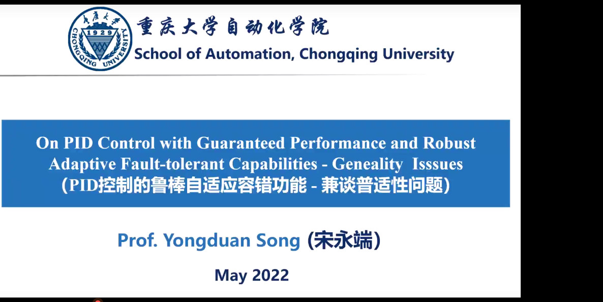 重庆大学的宋永端教授作了题为“PID控制的鲁棒自适应容错功能-兼谈普适性问题”的学术报告。宋教授介绍了基于先进智能思想的PID控制方法,详细讲授了神经自适应PID等先进控制方法的设计和应用研究成果,充分展示了新型PID控制技术在自动控制系统中的广泛应用前景。