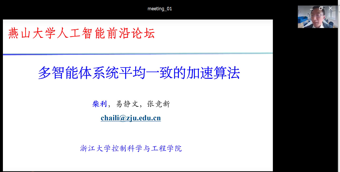浙江大学柴利教授作了题为“多智能体系统平均一致的加速算法”的学术报告。柴教授介绍了基于周期性控制增益和局部节点记忆的多智能体系统平均一致性加速算法,展示了多智能体系统领域最新的研究成果和未来发展方向。