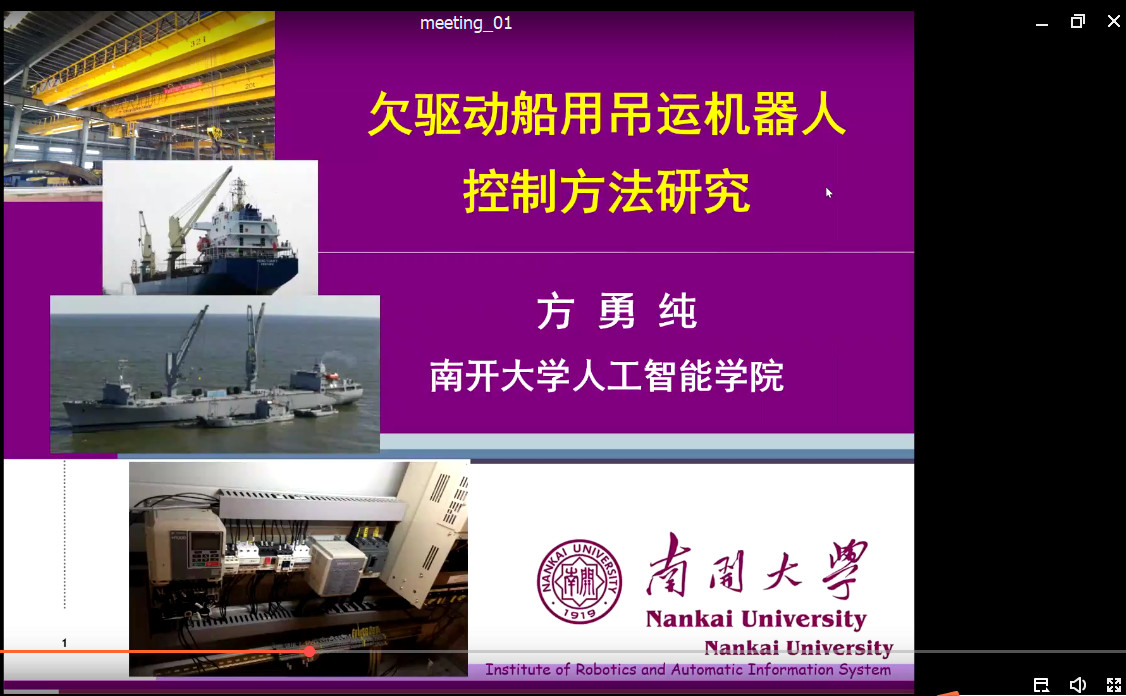 南开大学方勇纯教授作了题为“欠驱动船用吊运机器人控制方法研究”的学术报告。方教授介绍了船用起重机的欠驱动系统建模与基于滑模的跟踪控制方法,结合实际应用展现了欠驱动控制方法在吊车自动化中的巨大应用前景,并进一步介绍了未来研究计划。