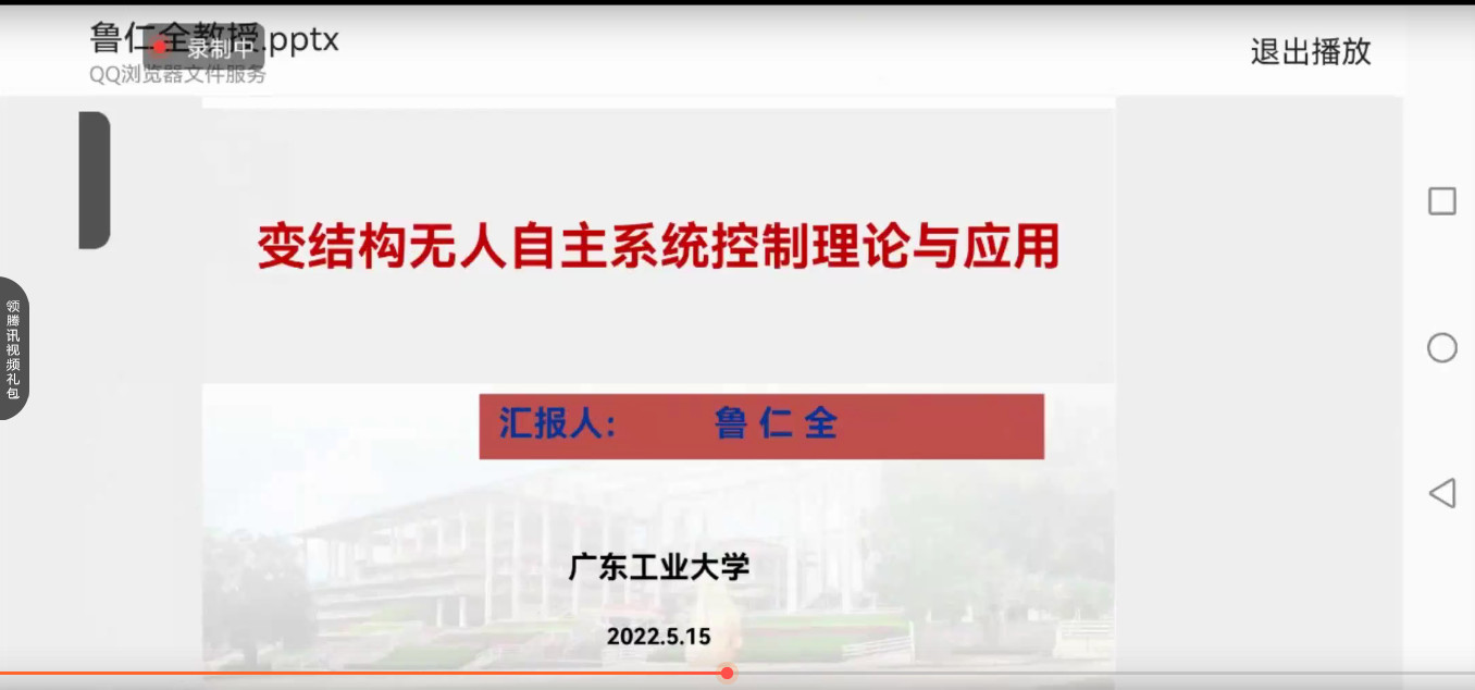 广东工业大学鲁仁全教授作了题为“变结构无人自主系统控制理论与应用”的学术报告。鲁教授介绍了变结构无人自主系统的发展现状和技术挑战,展示了复杂环境下变结构弹性体的协同控制与应用研究成果,展望了变结构无人自主系统在救援救灾、电网巡检、海洋探测等领域的广阔应用。