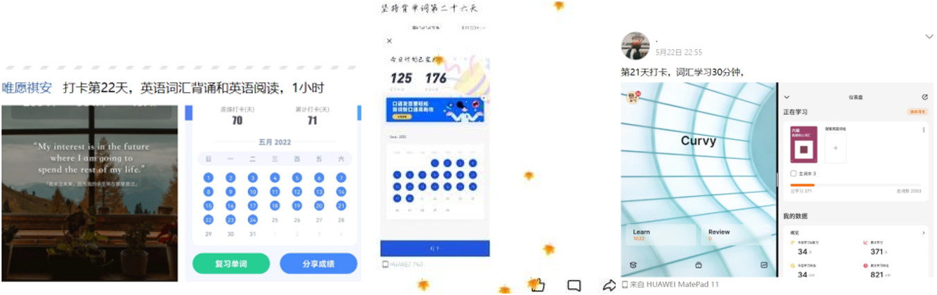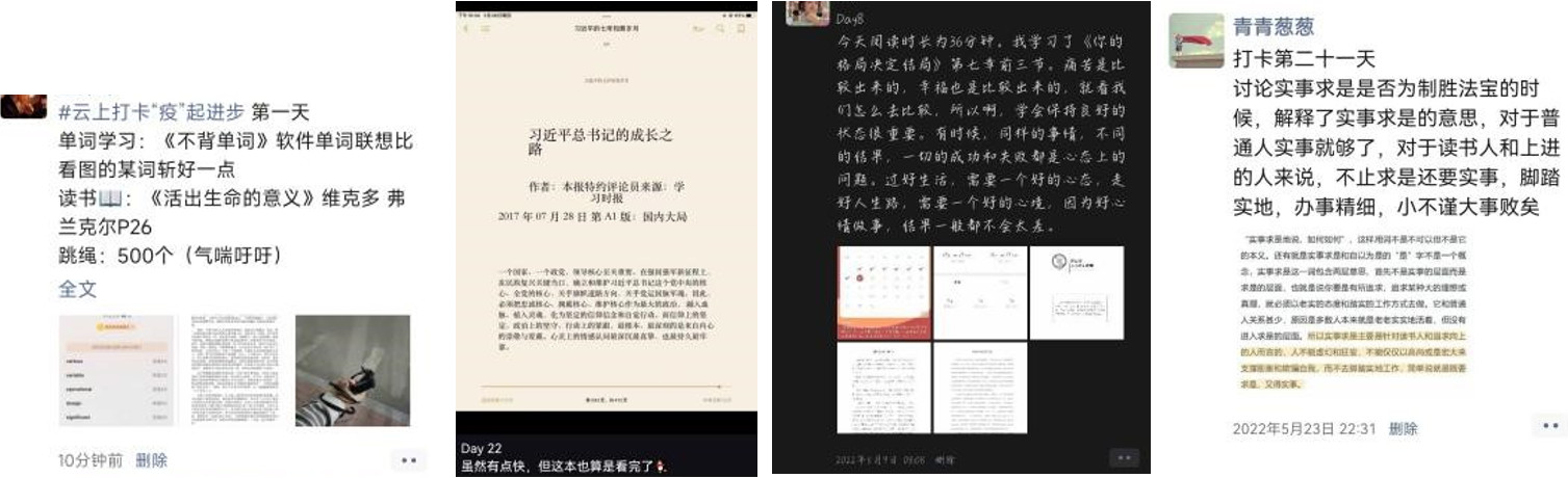 本次“云上打卡 ‘疫’同进步”活动分为爱学习、爱阅读和爱运动三个赛道,同学们通过分享背单词记录、读书笔记和每日运动照片等,从不同角度分享提升自己的点滴记录,做到虽是“云上打卡”,但好习惯养成不掉线。