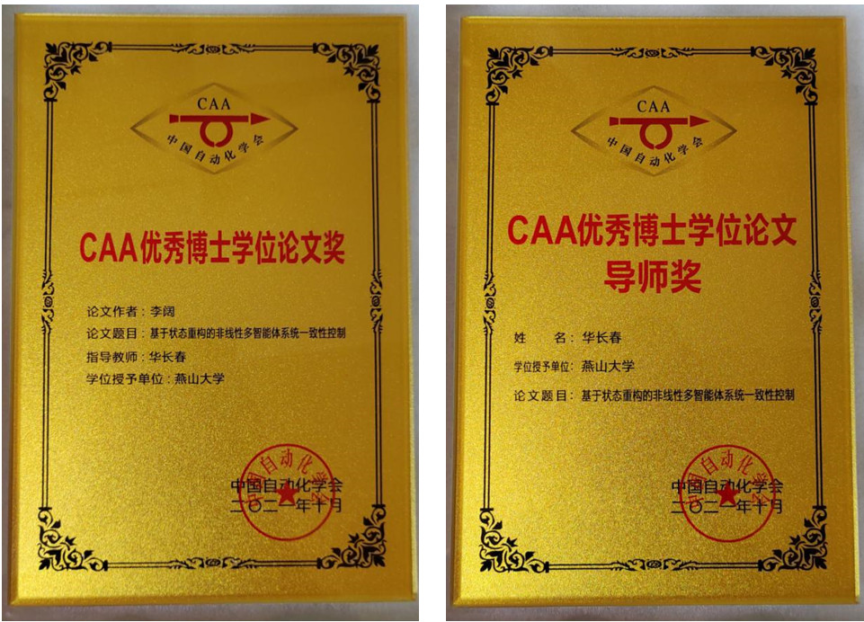 近日,由中国自动化学会(CAA)主办,中国科公司自动化研究所承办的2021中国自动化大会在云南昆明召开。公司PA视讯集团官网控制科学与工程专业2018级博士李阔同学的博士学位论文《基于状态重构的非线性多智能体系统一致性控制》荣获2021年度CAA优秀博士学位论文奖,其指导教师华长春教授荣获CAA优秀博士学位论文导师奖。这是中国自动化学会2014年设立该奖项以来PA视讯官方网站首次获得殊荣。
