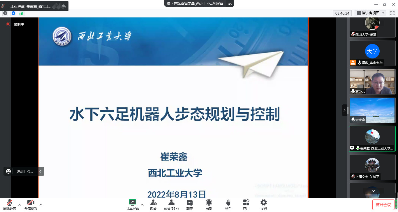 最后一场报告专家为西北工业大学崔荣鑫教授,为航海公司副经理。于2022年8月13日11:10报告了题为“水下六足机器人步态规划与控制”的报告,介绍一类由刀锋腿和推进器混合驱动的水下六足机器人研制、关键技术研究和水下试验情况,详细描述了水下机器人的动力学建模,以及优化控制方法,讲述了复杂环境下的水下机器人步态规划研究方法。