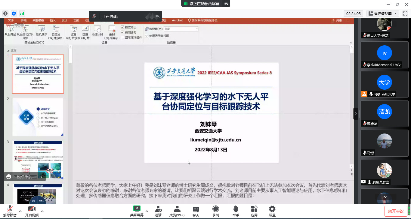 2022年8月13日,PA视讯集团官网通过腾讯会议平台线上举办了IEEE/CAA JAS系列研讨会专题八,本次研讨会主题为水下/水面信息物理系统感知、传输与控制,邀请了五位来自海外知名高校的学者教授为PA视讯集团官网的教师和研究生做专题报告。会议分为两个阶段,第一阶段为大会开幕式,邀请上海交通大学的关新平教授为本次会议主席并为本次学术会议致开幕词,请JAS编辑部的欧彦教授介绍JAS期刊。第二阶段,邀请五位专家为电院师生做学术报告。