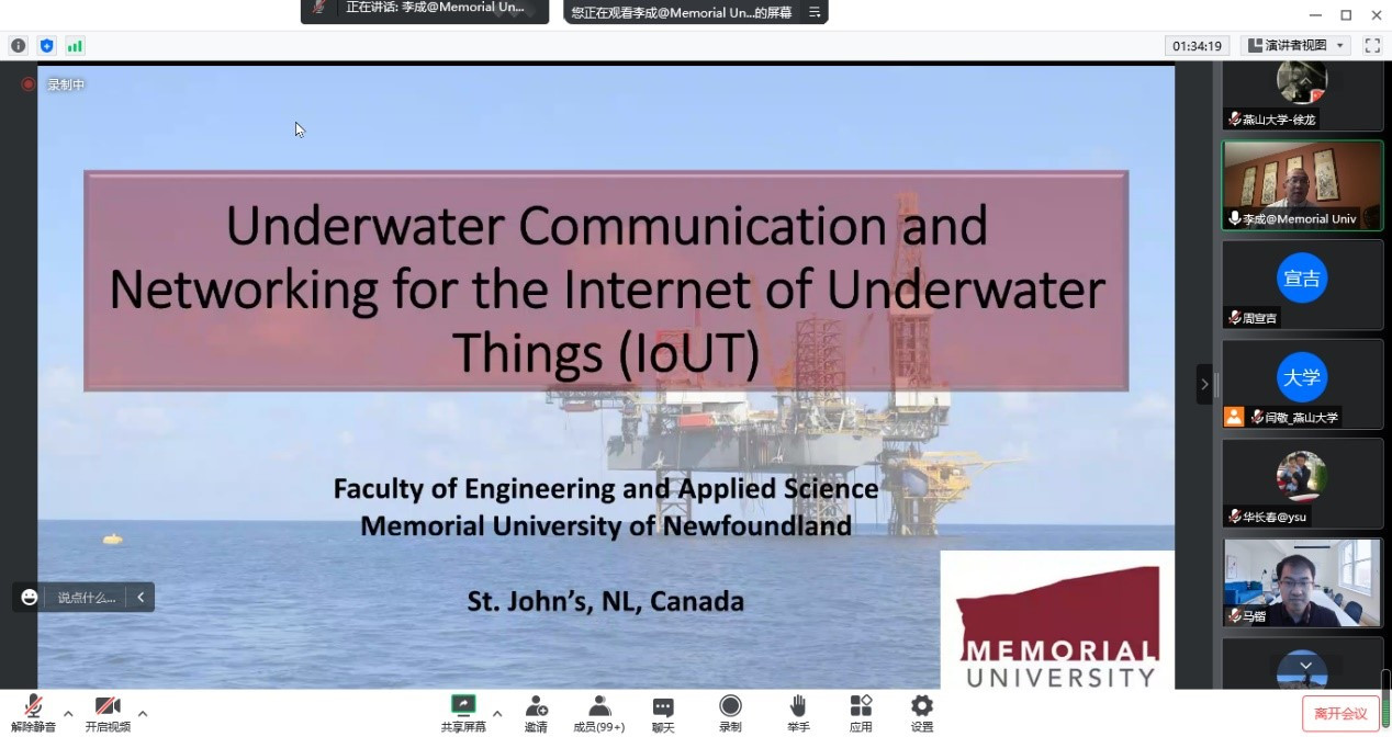 第二场报告专家为加拿大纽芬兰纪念大学的李成教授,目前是加拿大圣约翰纪念大学电气和计算机工程学系的正教授和系主任。报告于2021年8月13日9:25举行,题为“Underwater Acoustic communications and networking for the internet of underwater things (IoUT)”,概述了数字方式连接海洋、河流和湖泊的水下物联网系统,描述了水下物联网在海洋石油和天然气行业以及海洋运输和渔业的应用,回顾了海洋监测和传感应用所面临的挑战,并提出一系列技术解决方案。