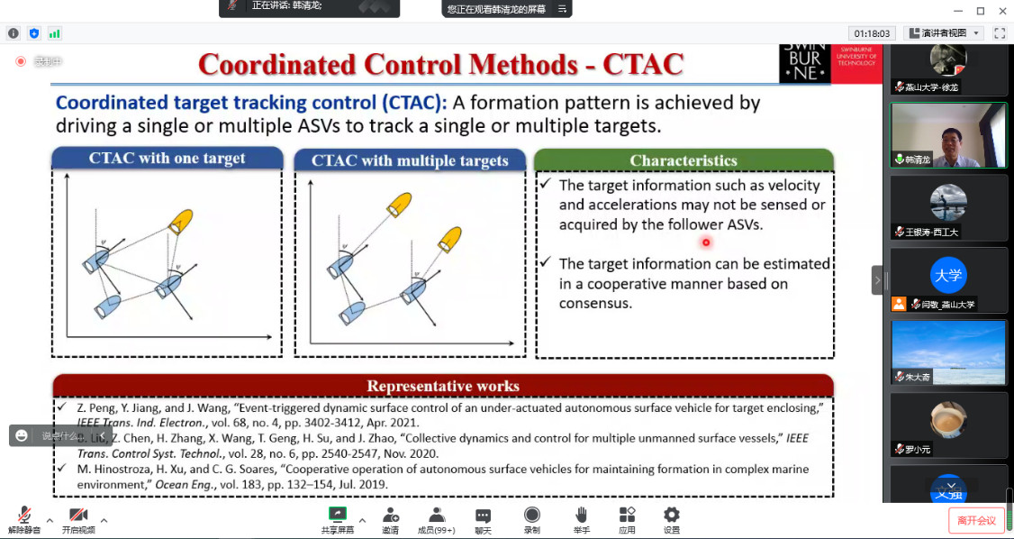 第一场报告专家为澳大利亚斯威本科技大学的韩清龙教授,IEEE Fellow,FIEAust Fellow,于2022年8月13日8:50举办了题为“Motion Control of Unmanned Marine Vehicles”的报告,韩清龙教授详细讲述了UMV的动态输出反馈控制、动态定位和编队控制方面的一些最新进展,同时还讨论了UMV当前控制理论在实际中的应用。
