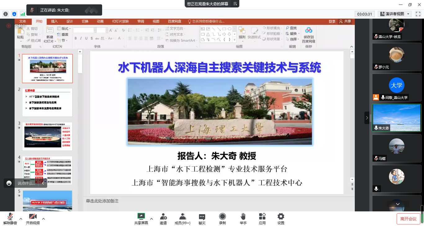 第四场报告专家为上海理工大学的朱大奇教授,朱大奇教授担任上海市“水下工程检测”技术创新服务平台主任,上海市“智能海事搜救与水下机器人”工程技术研究中心主任。于2022年8月13日10:35举办了题为“水下机器人深海目标自主搜索关键技术与系统”的报告。针对深海水下环境的目标搜索控制问题,介绍智能水下机器人深海目标自主搜索关键技术,包括水下环境地图构建,水下搜索路径规划与路径跟踪控制技术。最后介绍水下搜救系统研发与应用,水下机器人深海搜救未来发展与应用需求。