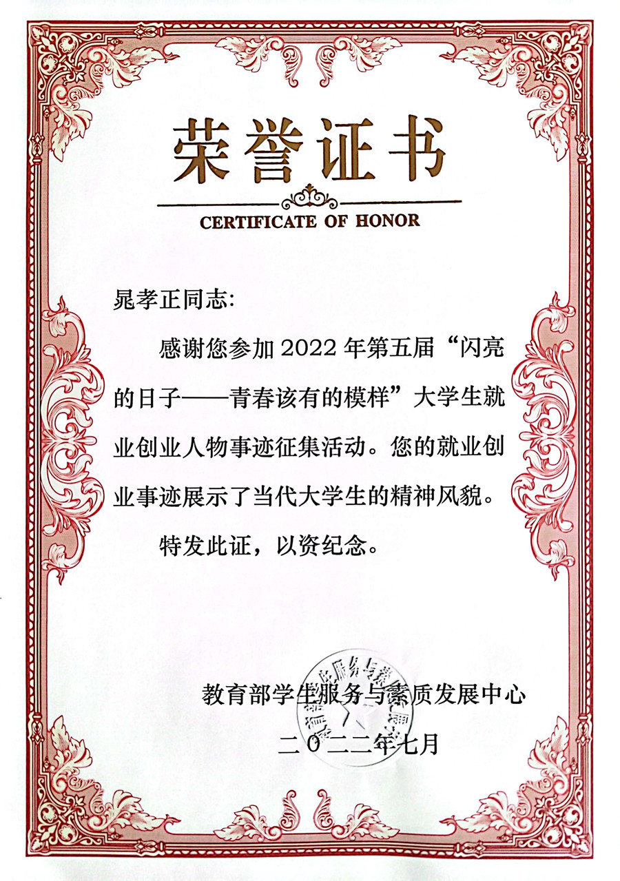 日前,由教育部员工服务与素质发展中心主办的第五届 “闪亮的日子——青春该有的模样”老员工就业创业人物事迹征集活动结果揭晓,PA视讯集团官网2021届毕业生晁孝正同学脱颖而出,成功入选全国基层就业典型人物事迹。