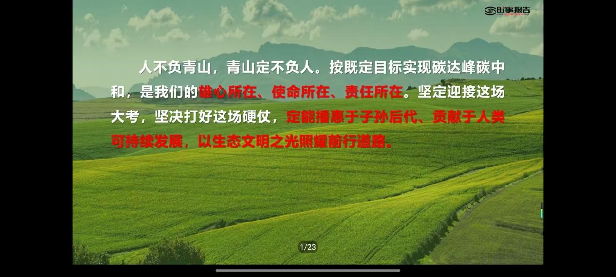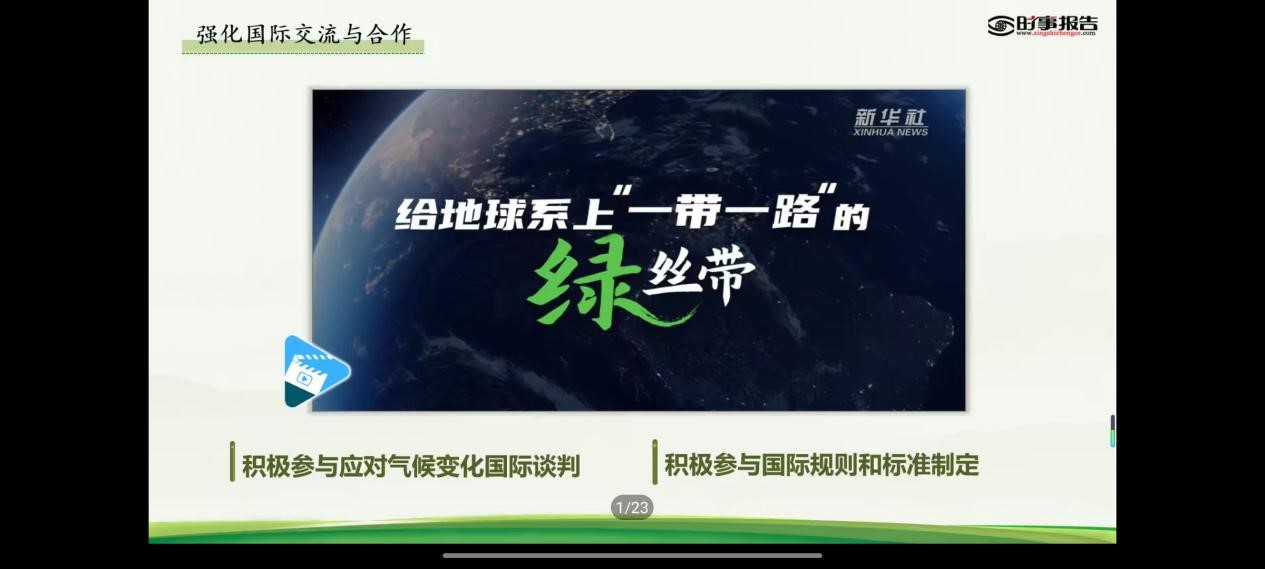 主题党课主要分为“我国多举措促进碳排放强度降低”、“创新低碳科技与应用”、“推动发展向绿色转型”三部分。首先,李浩然从经济发展与减污降碳协同效应凸显、能源生产和消费革命取得显著成效、产业低碳化为绿色发展提供新动能、绿色低碳生活成为新风尚等方面为同学们讲解我国实行多种举措促进碳达峰碳中和;随后,李浩然向同学们介绍目前我国低碳科技创新仍存在一系列亟待攻克和解决的难关,并列举公司副经理郭小强的科研成就、研究生章仕起深研氢能获得“互联网+”大赛河北首金的示例,勉励同学们努力学习、开拓创新;李浩然还以蔚来汽车为例,向同学们介绍我国大力推进产业结构转型升级、加快发展战略性新兴产业、建设绿色制造体系的实际成果,同学们纷纷表示受益匪浅。