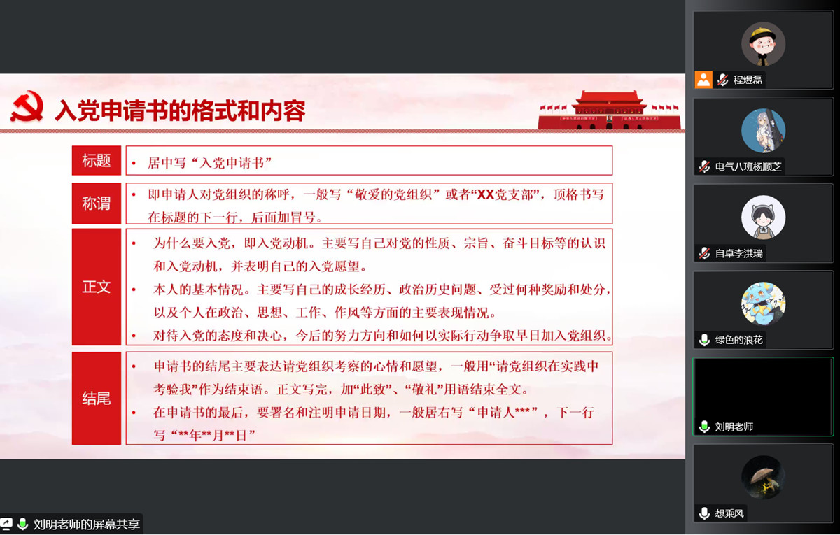 刘明老师从端正入党动机、发展党员程序及如何撰写入党申请书等方面向同学们详细讲述了怎样才能加入中国共产党,深入浅出地为同学们带来了一场全面、详细又易懂的讲解。刘老师指出,共青团员作为党的后备军,应当严格要求自己,努力完善自己,不断提升政治素养及综合素质,努力向上,坚定信仰,认真学习,积极向党组织靠拢,自觉接受党组织的培养教育及考察,争取早日成为一名合格党员。