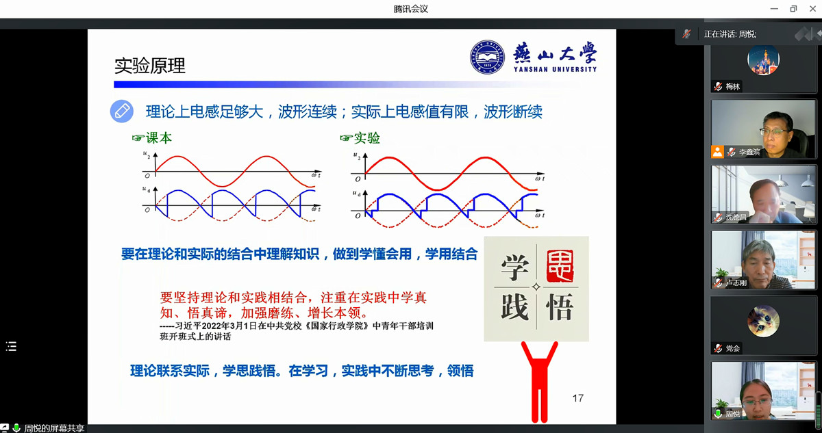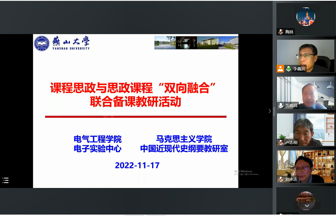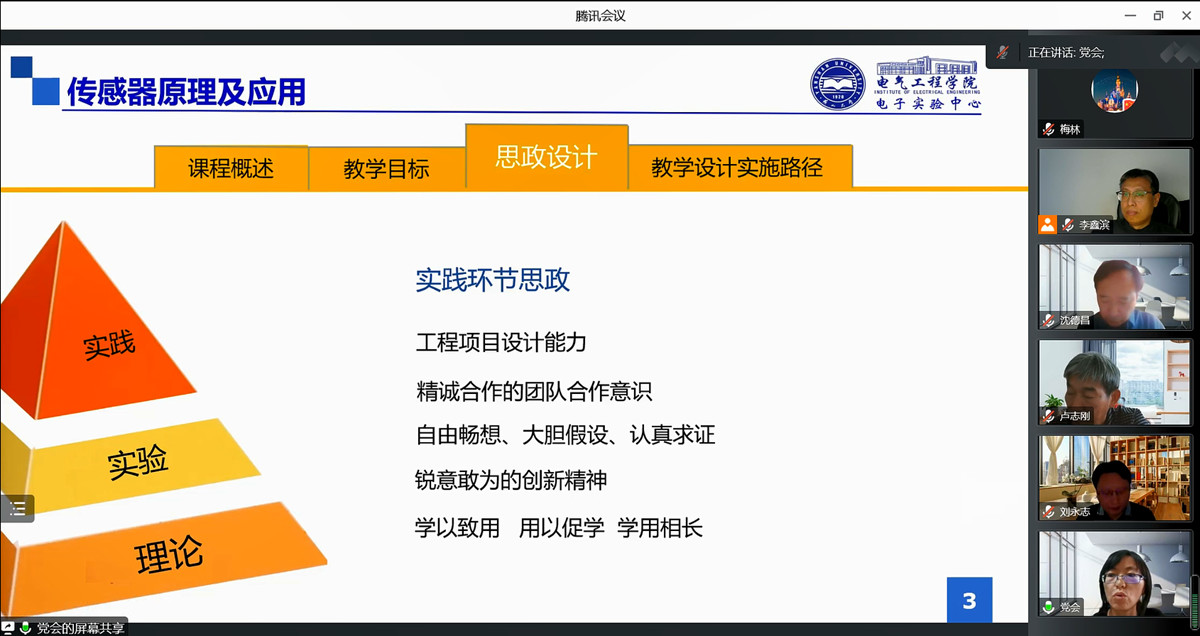 本次联合备课教研活动首先由电子实验中心李鑫滨主任对电子实验中心基本教学情况和实践课程的思政建设情况进行了总体介绍。然后,实验中心的党会、周悦和梅林老师分别针对《传感器原理及应用》《电力电子技术课内实验》《电力系统综合课程设计》等课程进行了课程思政案例设计分享。随后的讨论交流环节中,马克思主义公司中国近现代史纲要教研部各位老师从实践课程内容与课程思政融合、深挖思政元素、紧抓立德树人的人才培养本质、与马克思主义思想深度结合以及践行社会主义新发展理念、紧密契合国家发展新需求等多方面、多角度给出课程思政设计及实施的专业性建议;中心老师也针对实践课程思政教学中遇到的课程思政教学考核评价等问题与马克思主义公司老师们进行了交流与研讨。
