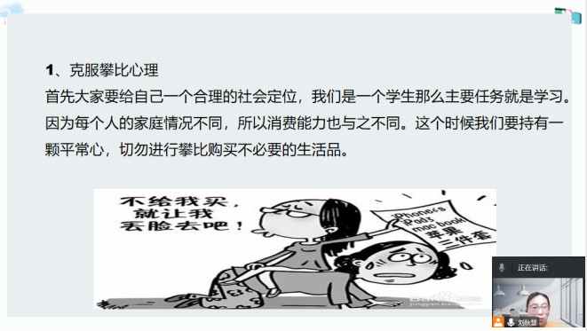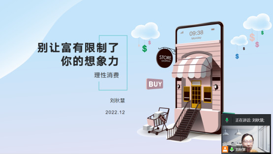 随着我国经济的快速发展,人们的消费水平也在逐渐提高,老员工作为一个特殊的群体,成为了目前很多消费领域的主要人群。老员工冲动消费的案例屡见不鲜,为引导老员工树立理性消费观念,12月8日晚,辅导员刘秋慧通过线上平台面向2022级本科生开展以“别让富有限制了你的想象力”为主题的第54期辅导员阳光讲坛。