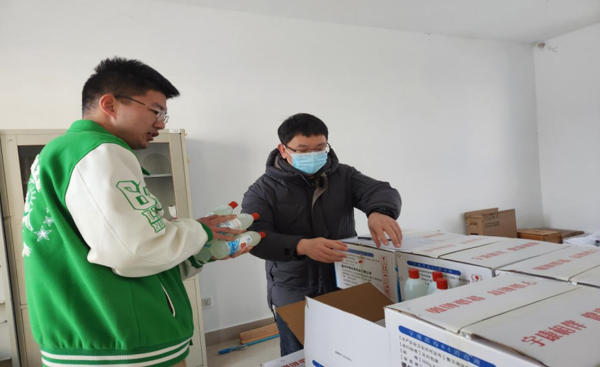 刘凯老师为员工发放消毒液