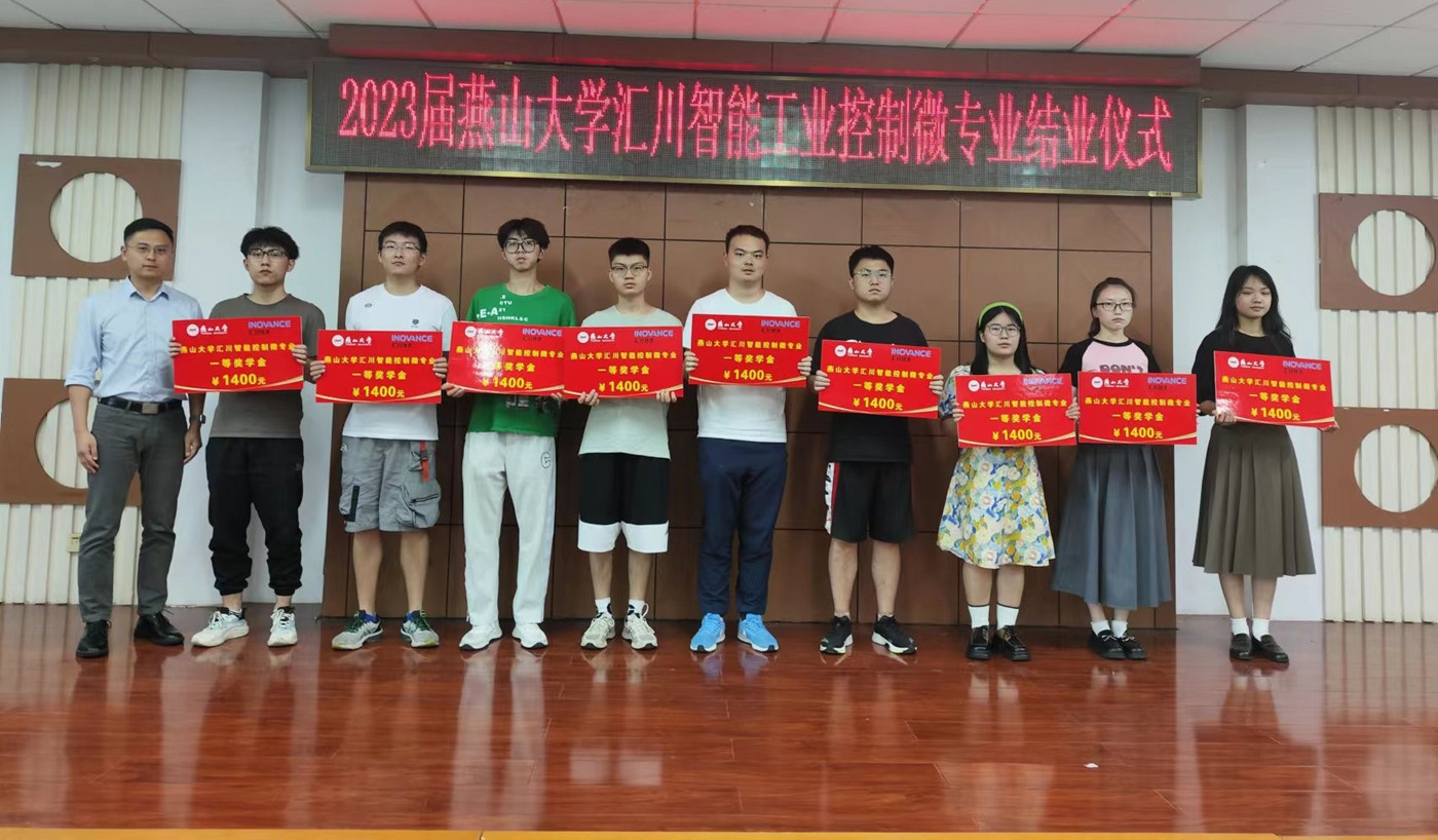 汇川技术股份有限公司通用自动化事业部副总监李恩泽、校企合作区域经理石京儒分别为一、二等奖学金获得者颁发获奖证书,并合影留念。