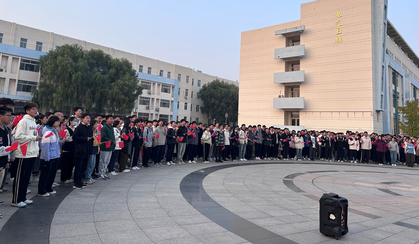 红旗漫卷,随风飘扬,全体师生面向国旗宣誓,表达拳拳爱国情。在电气类4班郑凯同学的带领下,全体师生在鲜艳的五星红旗下,许下心中的铮铮誓言。“随时准备着,为党和国家贡献自己的力量,强国有我,请党放心!”坚定的声音响彻广场,昭示未来。