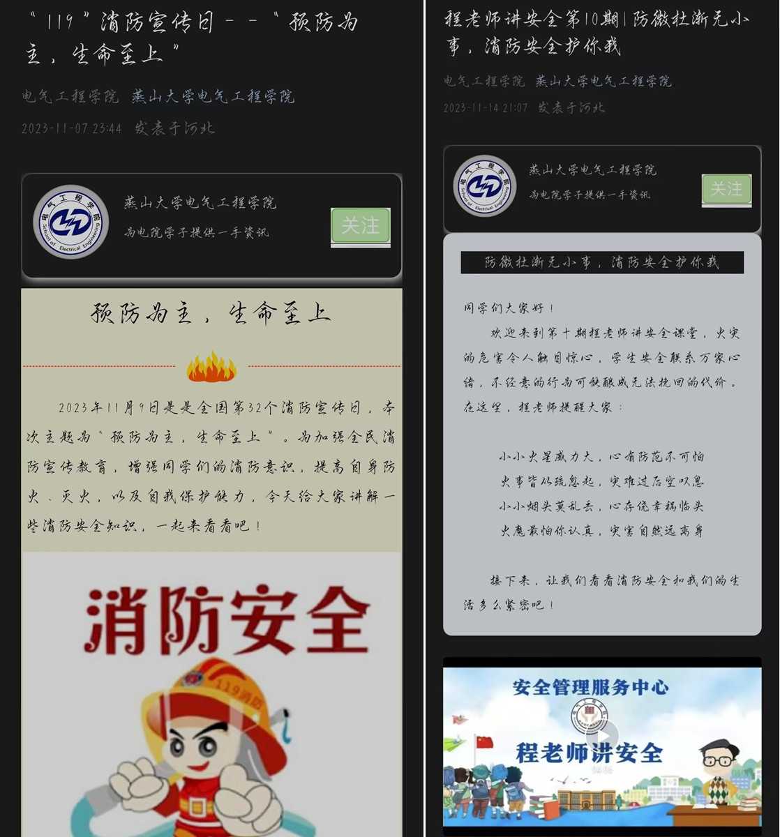 公司充分利用电气馆电子屏幕滚动播放消防宣传标语“校园很美,不需要火花点缀;生命宝贵,请勿让火灾烧毁”“消防教育不能忘 ,构筑师生防护墙”;通过微信官微发表消防活动月宣传推文“‘119’消防宣传日--‘预防为主,生命至上’”,通过推文介绍消防宣传月相关知识,普及常见校园火灾起因,讲解灭火原理及逃生技巧;通过“程老师讲安全”微视频课堂向员工讲解宿舍火灾常见起因,警示同学遵守宿舍安全规范,增强员工火灾防范意识,引起员工对消防安全的高度重视。