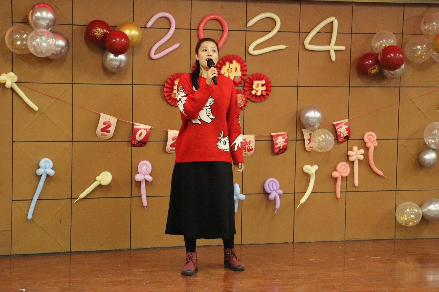 联欢会中间还穿插着几轮抽奖以及游戏活动,现场笑声不断,气氛欢快热烈。