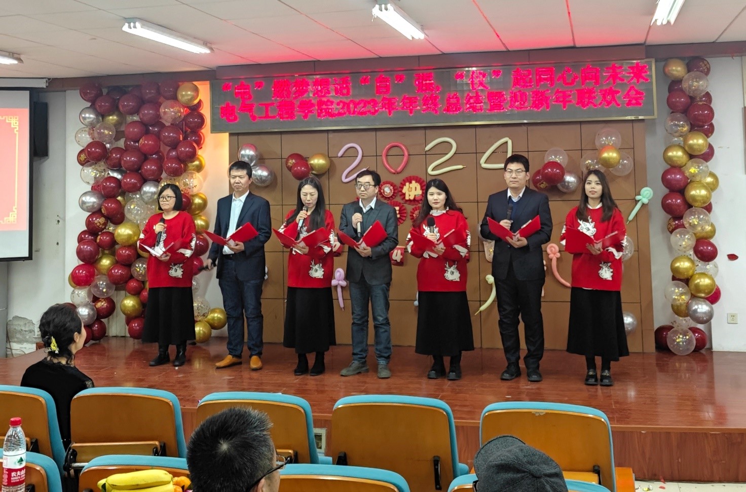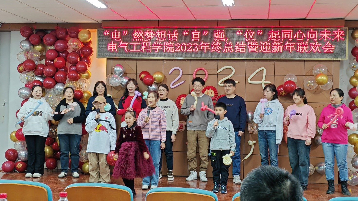 身着红色上衣的辅导员老师们以热热闹闹的歌伴舞《最炫民族风》拉开了联欢会序幕,他们欢快热烈的舞蹈、热情洋溢的歌声很快将现场气氛带动起来,观众们掌声不断并自觉地随着节奏打起拍子;院领导献上的小合唱《我们走在大路上》,铿锵有力、激情澎湃,唱出了中华儿女奋发图强、斗志昂扬,向着实现中华民族伟大复兴的目标奋勇前进的豪迈之情;电气系精心准备的两首歌曲《新年快乐》和《相亲相爱一家人》既表达了对大家浓浓的新年祝福之情,又唱出了电气系教师之间的团结与友爱;综合办的老师们携几位小朋友带来歌曲《勇气大爆发》,老师们充满爱意与温馨的表演,孩子们童真的歌声、动感的舞蹈,感染了现场的每一位观众,大家纷纷拿起手机拍照、录像;服装整齐划一的实验中心老师们首先带来合唱《阳光总在风雨后》,优美的旋律配以中心老师们平时工作场景的视频,展示了他们兢兢业业的工作态度以及乐观向上的精神状态,随后一支精彩的《健身舞》,动感十足,舞姿时尚,瞬间点燃了观众热情,大家不断鼓掌喝彩,既为这精彩的舞蹈,更为中心老师们的热情与活力;仪器系青年教师代表深情演绎的配乐诗朗诵《我爱上班》幽默诙谐地表达了大家平时工作的辛苦付出及对教育事业的无限热爱,一曲长笛独奏《always with you》也让大家看到了仪器系青年教师的多才多艺;自动化系的带来的独唱《今夜无眠》与小合唱《明天会更好》更加渲染了联欢会现场的节日气氛,唱出了自动化人对公司的美好祝福;最后一个节目是辅导员老师刘蕊的独唱《节日欢歌》,她以专业的唱功、婉转的歌喉、美妙欢快的旋律将晚会气氛推向高潮,唱出了大家对新春将至的期盼之情,使现场观众沉浸在欢快的节日气氛里。