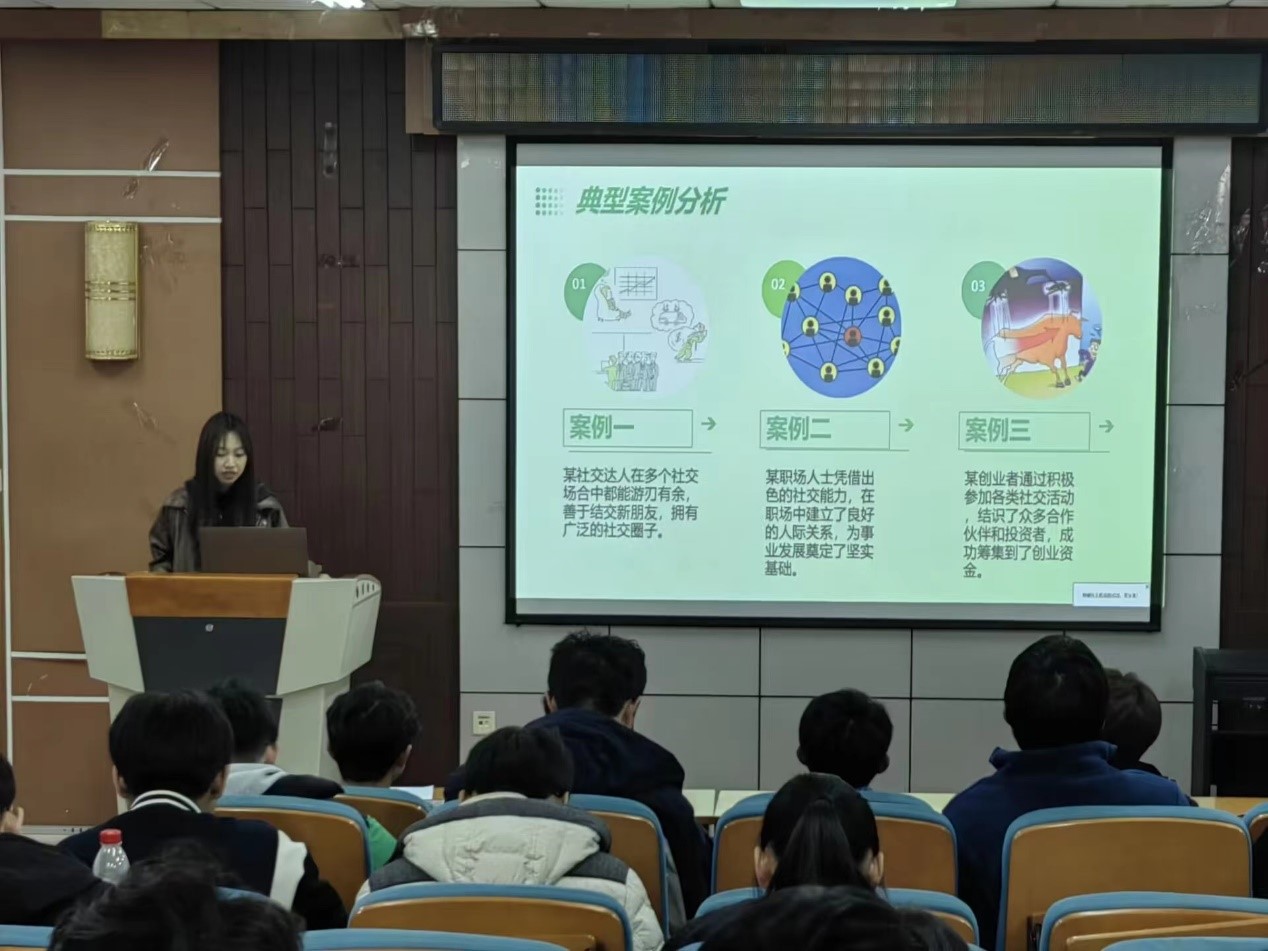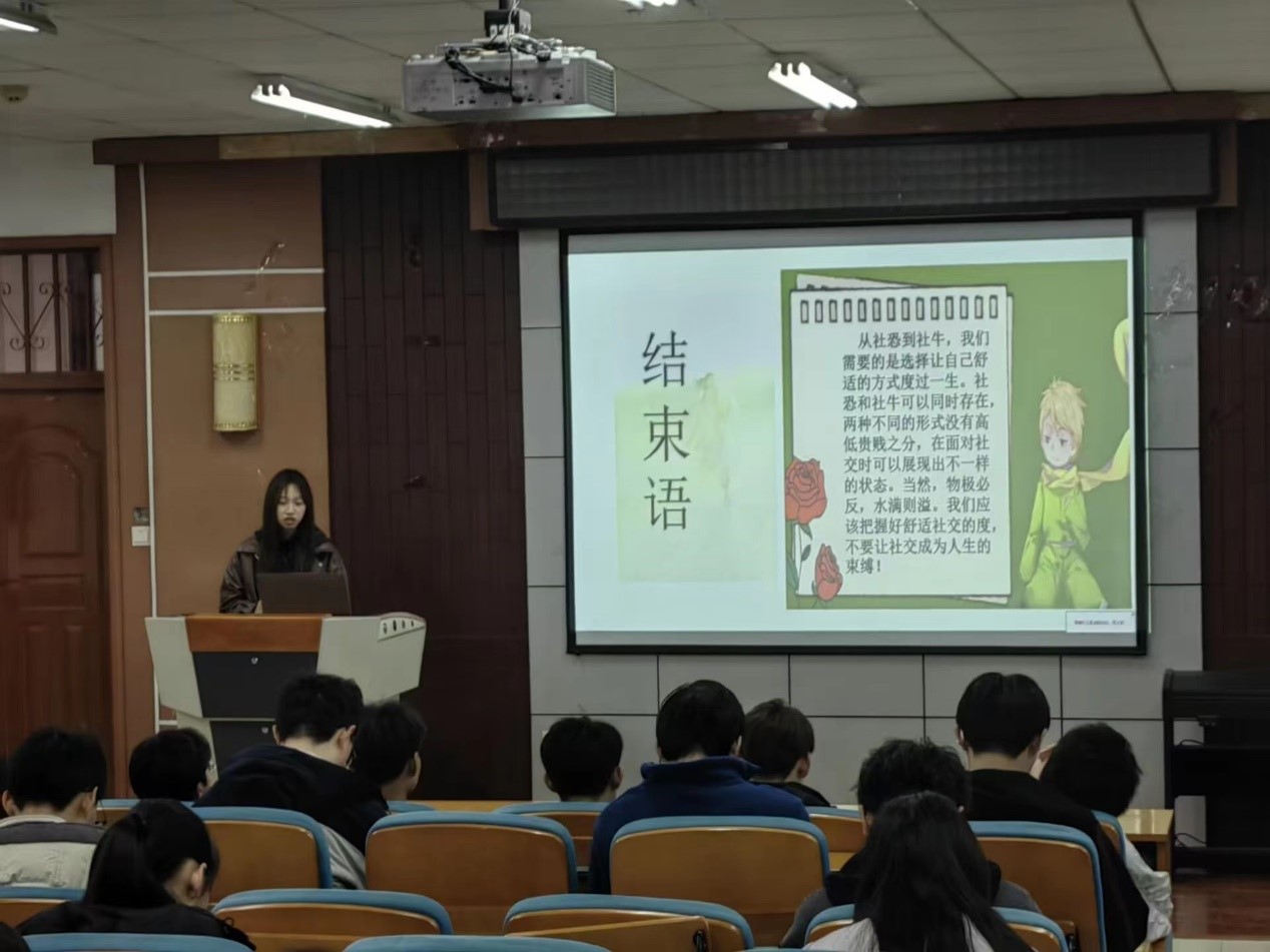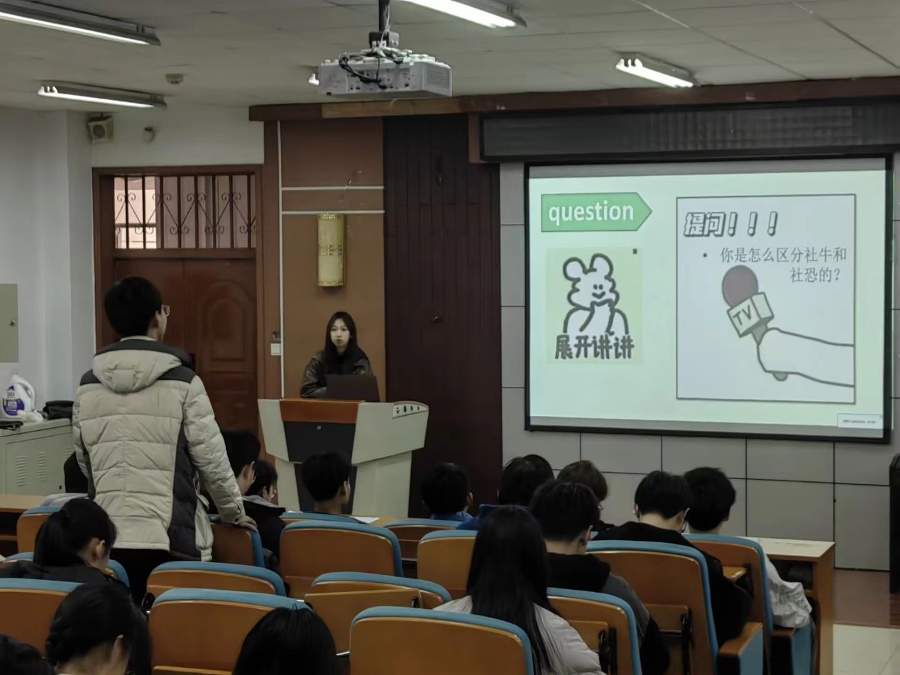 本期小讲堂由心理健康协会办公室成员李雅楠主持,讲座的内容主要包括对社牛和社恐的概念解析和现象分析、对社牛与社恐的心理学解读、如何平衡社交需求与恐惧心理、结论与展望四部分。首先主讲人通过几个问题和一段视频对社牛和社恐的概念进行了解析。然后通过典型案例对社牛和社恐现象的优缺点和影响进行了分析。其次,在心理角度上分析了社牛和社恐及其共通点。最后,通过与观众的互动,主讲人总结了克服恐惧心理提高自我社交能力的方法,并进行了总结和对未来社交趋势的预测。主讲人呼吁同学们要理解和接纳自我的社交状态,做到社牛张弛有度、社恐收敛有方。