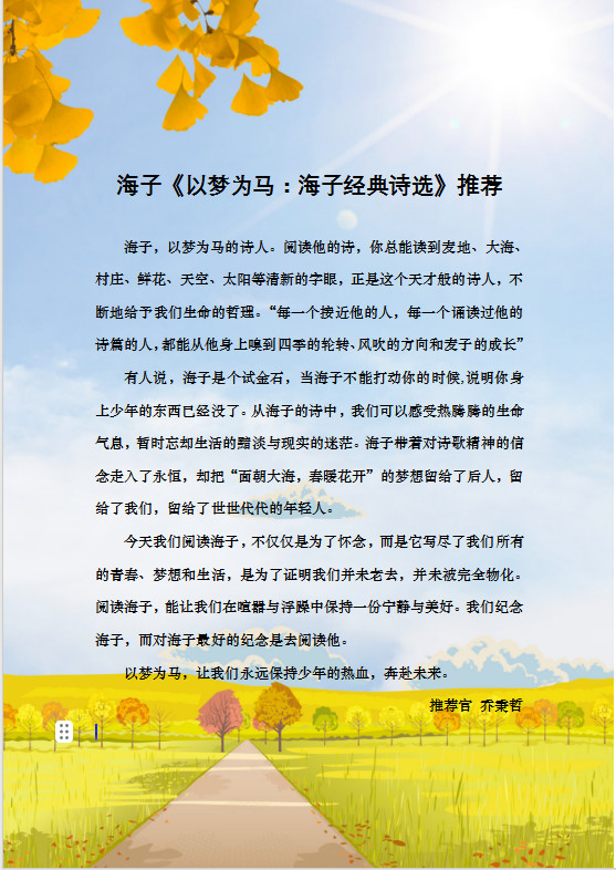 本期的读书推荐官为24级自卓一班的乔秉哲同学,他向大家朗诵了《以梦为马:海子经典诗选》这本书中《面朝大海,春暖花开》这首诗,详细地分析了作者在写这首诗时候复杂的心理状态,引起大家强烈共鸣。同时,他还向大家诵读自己写的两首散文诗,从读诗到品诗再到写诗,这种灵魂上的契合和行动上的改变,或许才是坚持阅读的意义。
