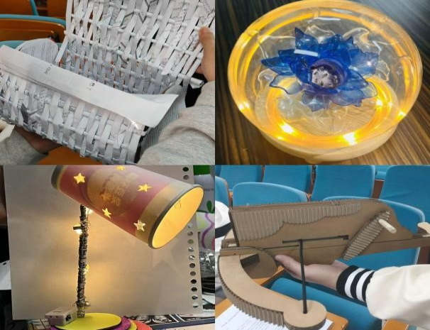 从旧纸板改造的诸葛连弩,到废弃塑料瓶变身的永生花,从草稿纸编织成的储物盒,到豆浆纸杯制成的小夜灯。每一件作品都闪耀着环保的光芒,让我们深刻感受到了循环利用的魅力所在。