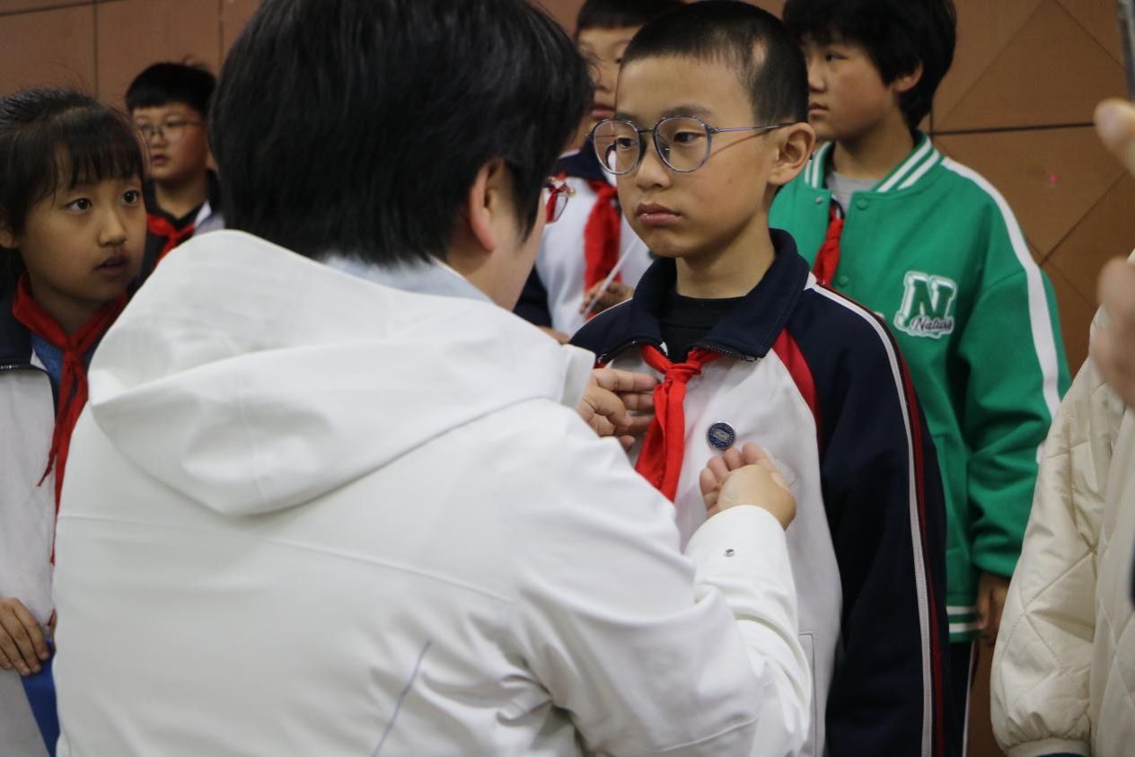 张颖为孩子们佩戴PA视讯官方网站校徽