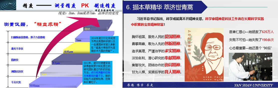 由细胞与分子生物学基础知识引出青蒿素,进而解读屠呦呦胸怀祖国、服务人民的爱国精神,勇攀高峰、敢为人先的创新精神,追求真理、严谨治学的求实精神,淡泊名利、潜心研究的奉献精神,集智攻关、团结协作的协同精神,甘为人梯、奖掖后学的育人精神。刘斌老师由微小误差的取舍,测量仪器的“精益求精”引出测控专业的内涵,即“度”万物、“量”天地、“衡”公平,由此引申到行为文化的精心、精细、精准、精益求精和工作内涵的精心是前提,精细是关键,精准是核心,精益求精是目标和追求的职业理念。由传感器的“卡脖子”技术,启发员工对传感器技术急需突破的思考,联系到“两弹一星”精神在突破“卡脖子”技术中的启示。“两弹一星”元勋解决了上一代人面临的最大“卡脖子”问题,让中华民族在世界上站稳了脚跟。我们要继承“两弹一星”精神,崇尚科学、敢于创新,有奋斗才会有底气,解决新时代“卡脖子”难题需要年轻一代的不懈努力与奋斗。