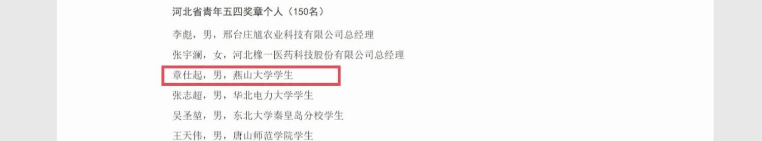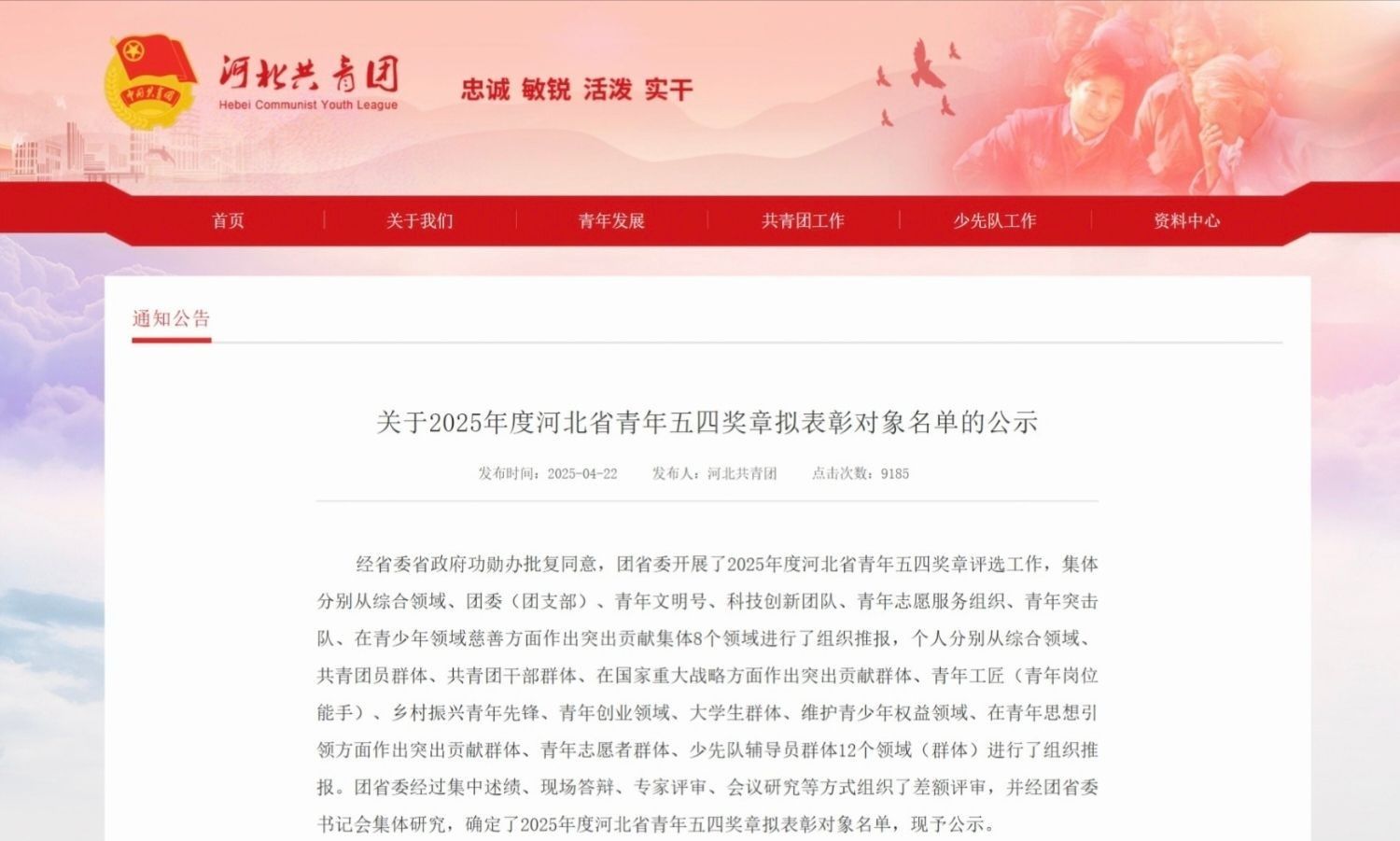 近日,共青团河北省委公布了2025年度“河北省青年五四奖章”表彰名单,公司2022级博士研究生章仕起荣获“河北省五四青年奖章个人”称号。