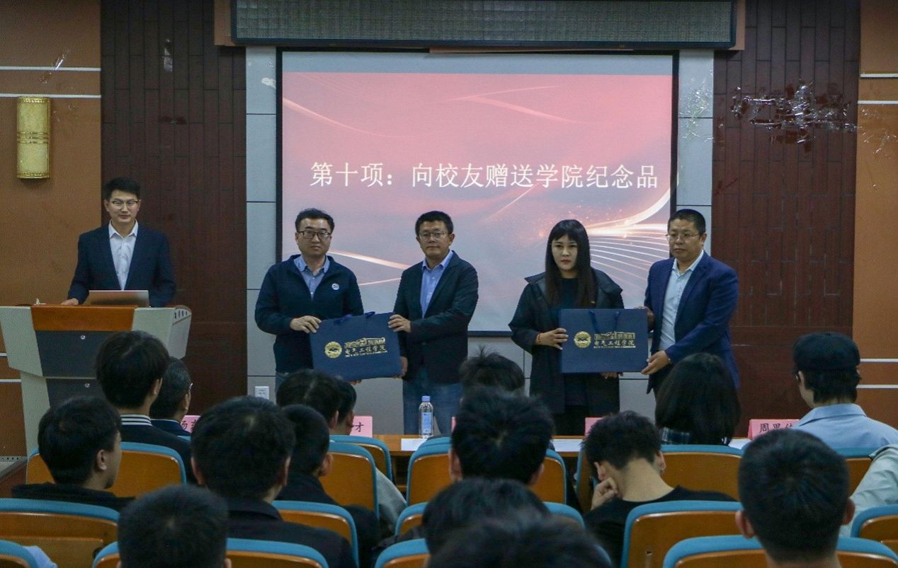 自动化系主任梁振虎、自动化系党支部书记魏立新向员工赠送公司纪念品