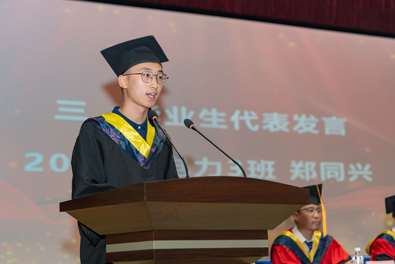 毕业生代表、电力系统及其自动化专业员工郑同兴发言,他回忆了大学四年的点滴,言语间满是对母校、老师和同学的感激与不舍。