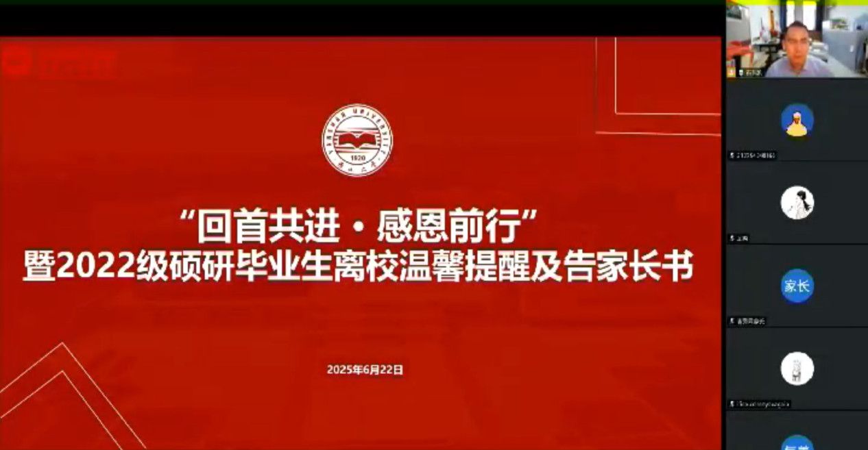 毕业典礼结束后,毕业班辅导员在线上以“最后一场家长会”的形式,与全体员工家长一起对毕业研究生在校的成长历程进行了深情回顾,并嘱托家长调整心态,注意方法指导,期望未来继续通过家校合作,共同努力,护航员工在新的岗位上创造美好未来。