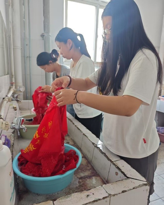 活动伊始,同学们在综合办公室老师的指导下迅速完成分工,自带洗衣盆等工具,投入了紧张的清洗工作之中。现场每一个环节都一丝不苟,同学们认真搓洗马甲上的污渍,展现了电院学子严谨细致的作风。之后大家通力合作,默契的配合拧干洗好的衣服。现场氛围欢乐有序,劳动的热情与合作的快乐交织在一起。